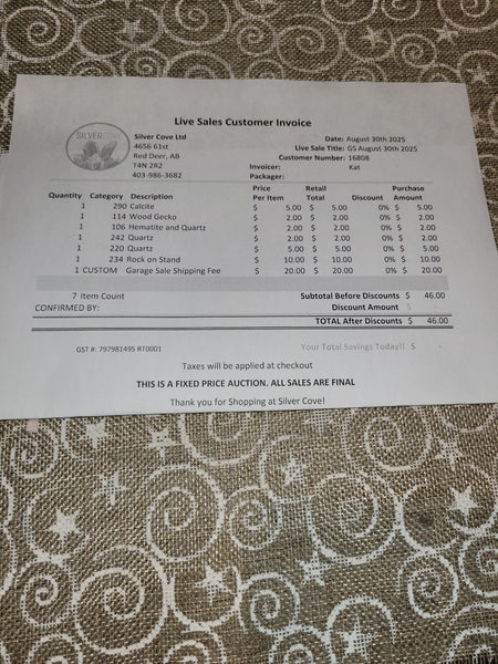 This is your invoice for the date listed above, and we hope you are as excited to get your items as we are! A photo of you invoice and your item(s) are included in this listing for you to review.