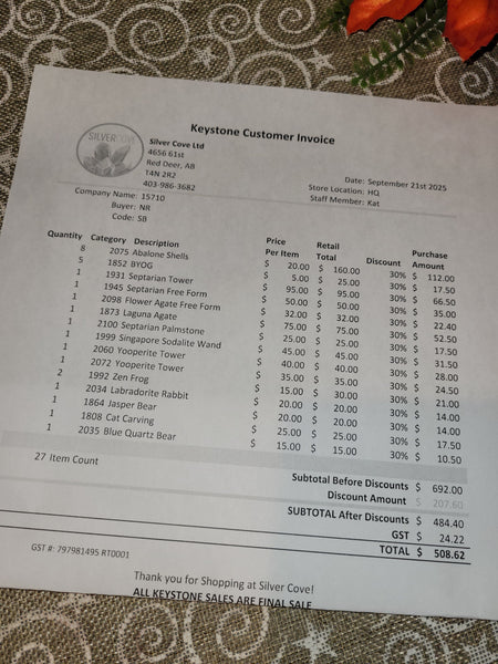The total is already discounted with any sales you received, and you invoice is ready for check out. All you need to do is add it to your cart, along with any other items you would like to purchase and we will get your treasures on the way!