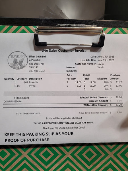 This is your invoice for the date listed above, and we hope you are as excited to get your items as we are! A photo of you invoice and your item(s) are included in this listing for you to review.