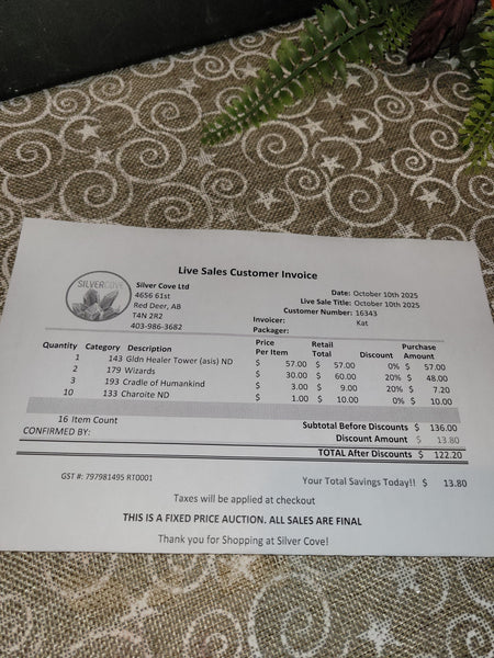 The total is already discounted with any sales you received, and you invoice is ready for check out. All you need to do is add it to your cart, along with any other items you would like to purchase and we will get your treasures on the way!