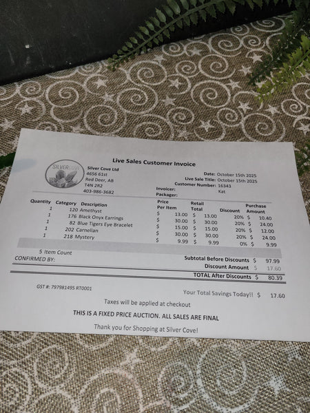The total is already discounted with any sales you received, and you invoice is ready for check out. All you need to do is add it to your cart, along with any other items you would like to purchase and we will get your treasures on the way!