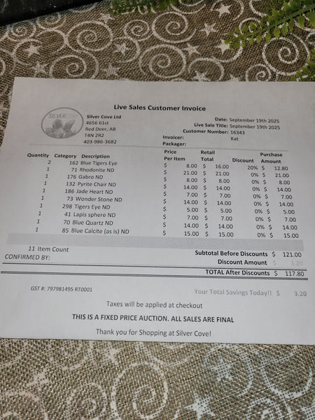 The total is already discounted with any sales you received, and you invoice is ready for check out. All you need to do is add it to your cart, along with any other items you would like to purchase and we will get your treasures on the way!