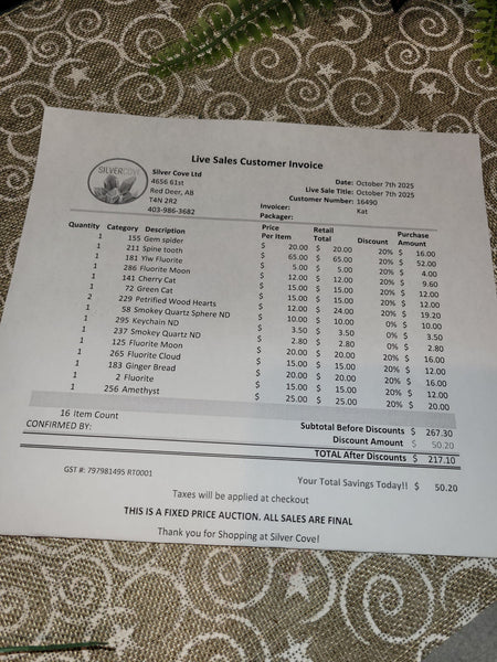 The total is already discounted with any sales you received, and you invoice is ready for check out. All you need to do is add it to your cart, along with any other items you would like to purchase and we will get your treasures on the way!