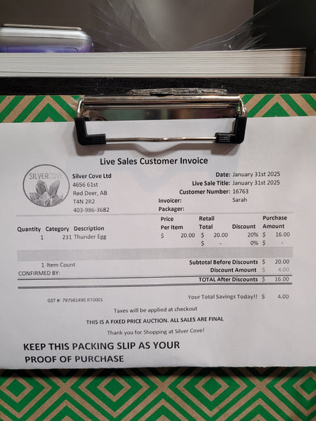 This is your invoice for the date listed above, and we hope you are as excited to get your items as we are! A photo of you invoice and your item(s) are included in this listing for you to review.