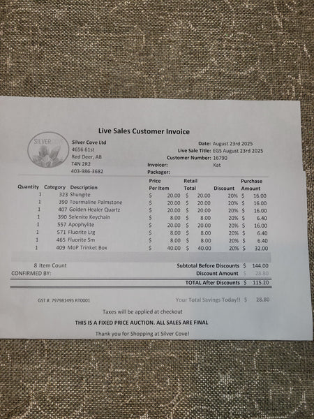 We hope you had a wonderful time on our recent live sale auction. We love sharing our passion for the mineral kingdom with you. Below you will find the packing list with the items you purchased. These items are wrapped, packed, and ready to go when you are.Β Items purchased in the auction are due within 14 days of the live. Invoices can be combined in your cart, allowing you to check out multiple live events, plus items on the online store seamlessly. If any of the items were already discounted in the live sale auction, you will see them in a separate column in the listing below. We will reverse engineer the listing so that it reflects properly in your cart.Β  We love what we do and thank you for being a part of our success. We hope to see you on another live sale auction very soon.