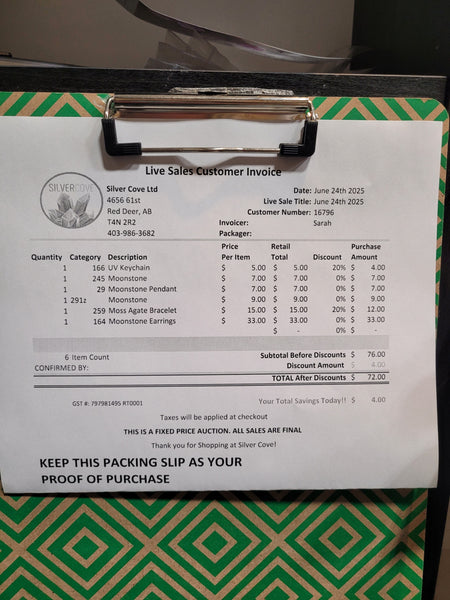 This is your invoice for the date listed above, and we hope you are as excited to get your items as we are! A photo of you invoice and your item(s) are included in this listing for you to review.