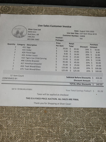 We hope you had a wonderful time on our recent live sale auction. We love sharing our passion for the mineral kingdom with you. Below you will find the packing list with the items you purchased. These items are wrapped, packed, and ready to go when you are.Β Items purchased in the auction are due within 14 days of the live. Invoices can be combined in your cart, allowing you to check out multiple live events, plus items on the online store seamlessly. If any of the items were already discounted in the live sale auction, you will see them in a separate column in the listing below. We will reverse engineer the listing so that it reflects properly in your cart.Β  We love what we do and thank you for being a part of our success. We hope to see you on another live sale auction very soon.