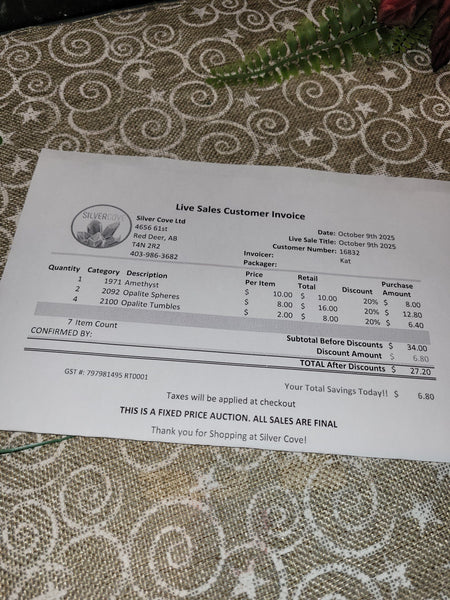 The total is already discounted with any sales you received, and you invoice is ready for check out. All you need to do is add it to your cart, along with any other items you would like to purchase and we will get your treasures on the way!