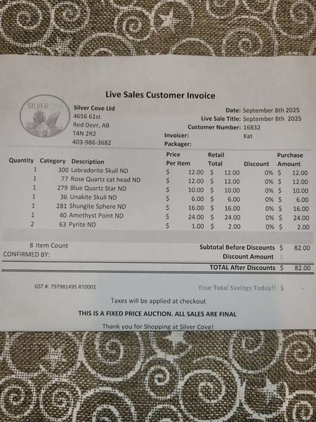 This is your invoice for the date listed above, and we hope you are as excited to get your items as we are! A photo of you invoice and your item(s) are included in this listing for you to review.