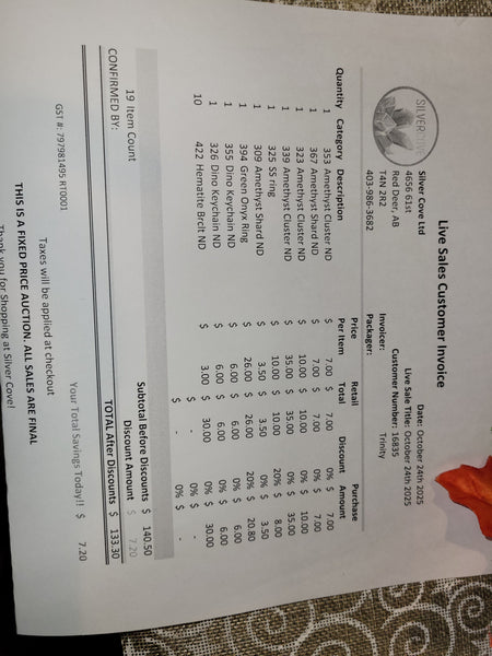 The total is already discounted with any sales you received, and you invoice is ready for check out. All you need to do is add it to your cart, along with any other items you would like to purchase and we will get your treasures on the way!