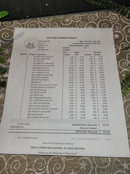 The total is already discounted with any sales you received, and you invoice is ready for check out. All you need to do is add it to your cart, along with any other items you would like to purchase and we will get your treasures on the way!