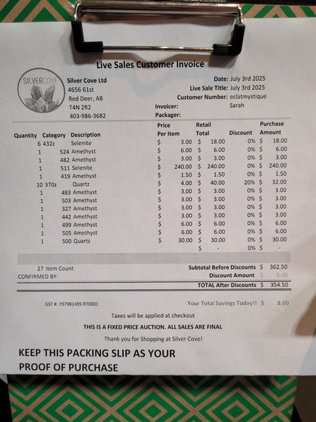The total is already discounted with any sales you received, and you invoice is ready for check out. All you need to do is add it to your cart, along with any other items you would like to purchase and we will get your treasures on the way!