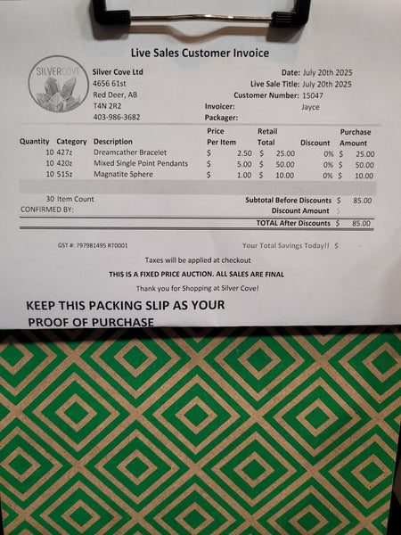 This is your invoice for the date listed above, and we hope you are as excited to get your items as we are! A photo of you invoice and your item(s) are included in this listing for you to review.
