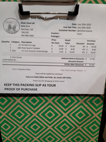 This is your invoice for the date listed above, and we hope you are as excited to get your items as we are! A photo of you invoice and your item(s) are included in this listing for you to review.