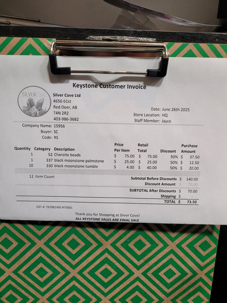 The total is already discounted with any sales you received, and you invoice is ready for check out. All you need to do is add it to your cart, along with any other items you would like to purchase and we will get your treasures on the way!