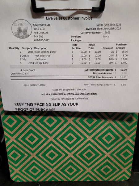 This is your invoice for the date listed above, and we hope you are as excited to get your items as we are! A photo of you invoice and your item(s) are included in this listing for you to review.
