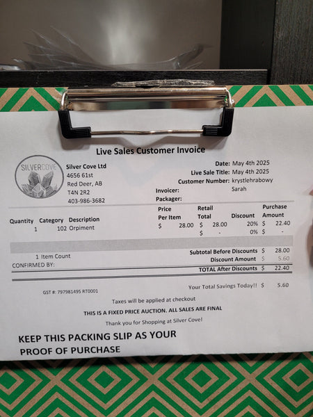 This is your invoice for the date listed above, and we hope you are as excited to get your items as we are! A photo of you invoice and your item(s) are included in this listing for you to review.