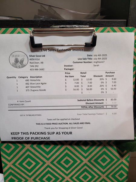 This is your invoice for the date listed above, and we hope you are as excited to get your items as we are! A photo of you invoice and your item(s) are included in this listing for you to review.