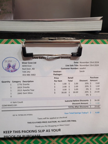 The total is already discounted with any sales you received, and you invoice is ready for check out. All you need to do is add it to your cart, along with any other items you would like to purchase and we will get your treasures on the way!