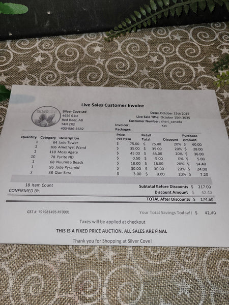 The total is already discounted with any sales you received, and you invoice is ready for check out. All you need to do is add it to your cart, along with any other items you would like to purchase and we will get your treasures on the way!