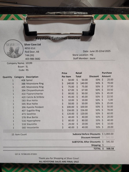 The total is already discounted with any sales you received, and you invoice is ready for check out. All you need to do is add it to your cart, along with any other items you would like to purchase and we will get your treasures on the way!