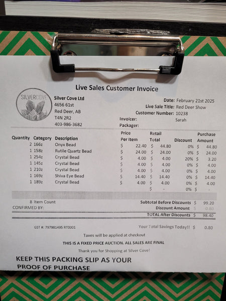 The total is already discounted with any sales you received, and you invoice is ready for check out. All you need to do is add it to your cart, along with any other items you would like to purchase and we will get your treasures on the way!