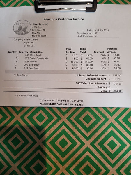 The total is already discounted with any sales you received, and you invoice is ready for check out. All you need to do is add it to your cart, along with any other items you would like to purchase and we will get your treasures on the way!