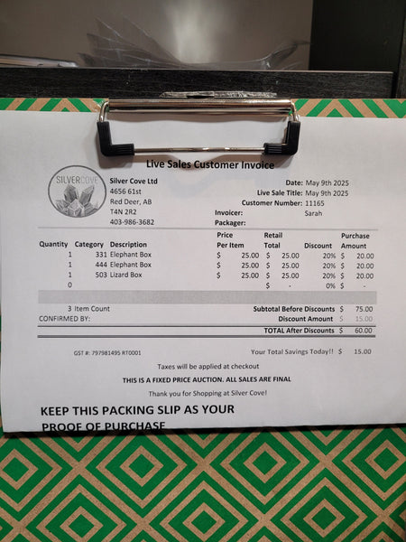 This is your invoice for the date listed above, and we hope you are as excited to get your items as we are! A photo of you invoice and your item(s) are included in this listing for you to review.