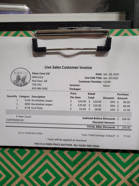 The total is already discounted with any sales you received, and you invoice is ready for check out. All you need to do is add it to your cart, along with any other items you would like to purchase and we will get your treasures on the way!