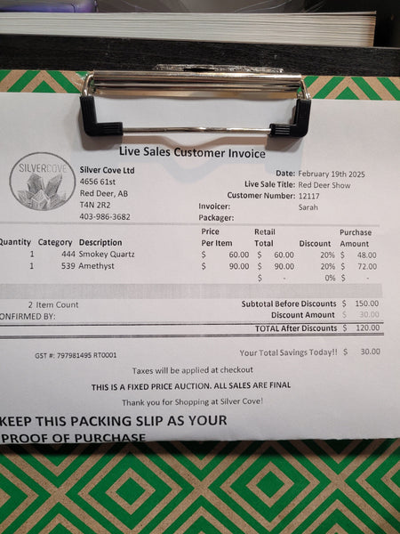 The total is already discounted with any sales you received, and you invoice is ready for check out. All you need to do is add it to your cart, along with any other items you would like to purchase and we will get your treasures on the way!