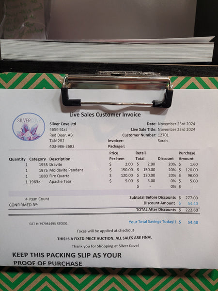 The total is already discounted with any sales you received, and you invoice is ready for check out. All you need to do is add it to your cart, along with any other items you would like to purchase and we will get your treasures on the way!