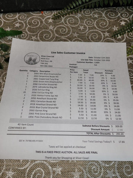 The total is already discounted with any sales you received, and you invoice is ready for check out. All you need to do is add it to your cart, along with any other items you would like to purchase and we will get your treasures on the way!