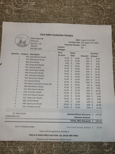 We hope you had a wonderful time on our recent live sale auction. We love sharing our passion for the mineral kingdom with you. Below you will find the packing list with the items you purchased. These items are wrapped, packed, and ready to go when you are. Items purchased in the auction are due within 14 days of the live. Invoices can be combined in your cart, allowing you to check out multiple live events, plus items on the online store seamlessly. If any of the items were already discounted in the live sale auction, you will see them in a separate column in the listing below. We will reverse engineer the listing so that it reflects properly in your cart.  We love what we do and thank you for being a part of our success. We hope to see you on another live sale auction very soon.