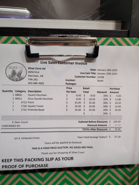 The total is already discounted with any sales you received, and you invoice is ready for check out. All you need to do is add it to your cart, along with any other items you would like to purchase and we will get your treasures on the way!