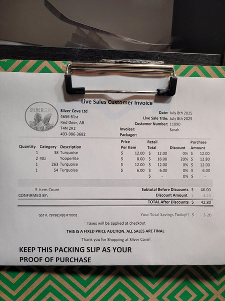 The total is already discounted with any sales you received, and you invoice is ready for check out. All you need to do is add it to your cart, along with any other items you would like to purchase and we will get your treasures on the way!