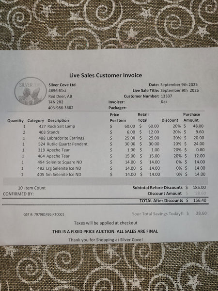 The total is already discounted with any sales you received, and you invoice is ready for check out. All you need to do is add it to your cart, along with any other items you would like to purchase and we will get your treasures on the way!