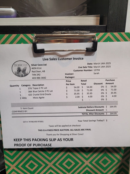 This is your invoice for the date listed above, and we hope you are as excited to get your items as we are! A photo of you invoice and your item(s) are included in this listing for you to review.