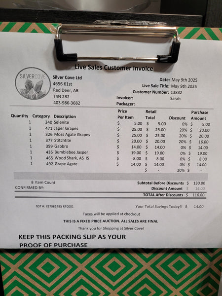 The total is already discounted with any sales you received, and you invoice is ready for check out. All you need to do is add it to your cart, along with any other items you would like to purchase and we will get your treasures on the way!