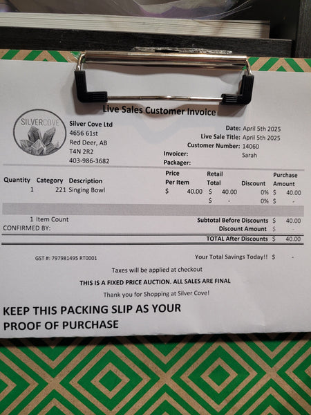 This is your invoice for the date listed above, and we hope you are as excited to get your items as we are! A photo of you invoice and your item(s) are included in this listing for you to review.