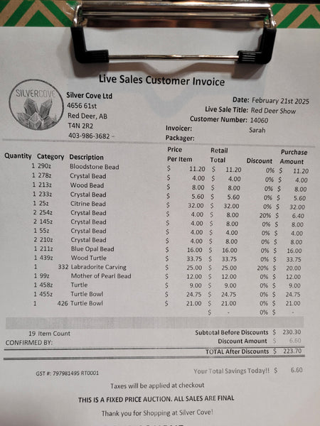 The total is already discounted with any sales you received, and you invoice is ready for check out. All you need to do is add it to your cart, along with any other items you would like to purchase and we will get your treasures on the way!