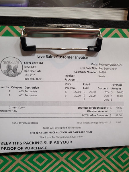 The total is already discounted with any sales you received, and you invoice is ready for check out. All you need to do is add it to your cart, along with any other items you would like to purchase and we will get your treasures on the way!