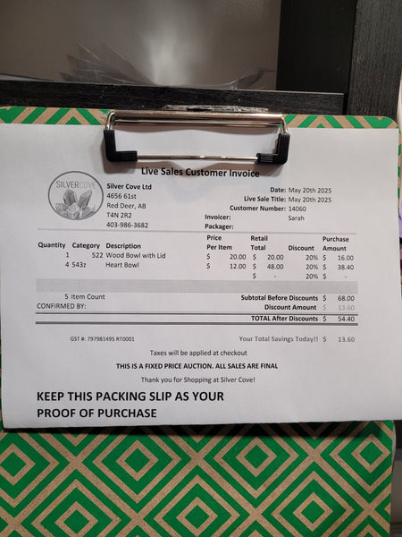 This is your invoice for the date listed above, and we hope you are as excited to get your items as we are! A photo of you invoice and your item(s) are included in this listing for you to review.