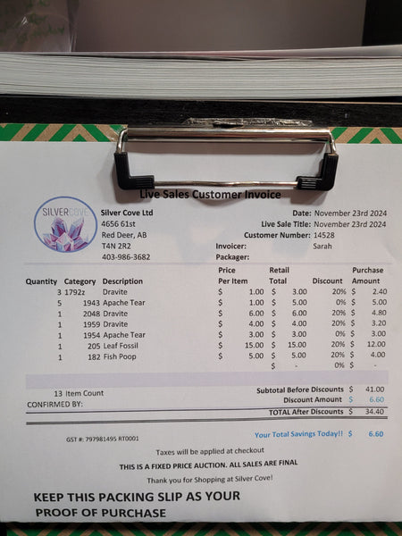 The total is already discounted with any sales you received, and you invoice is ready for check out. All you need to do is add it to your cart, along with any other items you would like to purchase and we will get your treasures on the way!