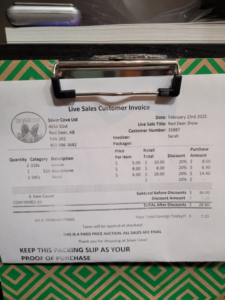 The total is already discounted with any sales you received, and you invoice is ready for check out. All you need to do is add it to your cart, along with any other items you would like to purchase and we will get your treasures on the way!