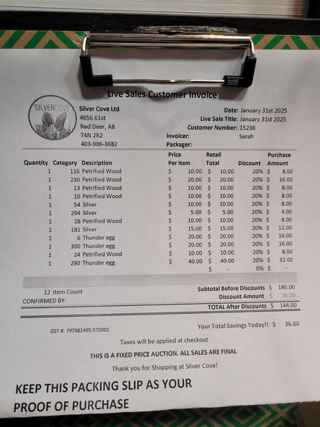 The total is already discounted with any sales you received, and you invoice is ready for check out. All you need to do is add it to your cart, along with any other items you would like to purchase and we will get your treasures on the way!