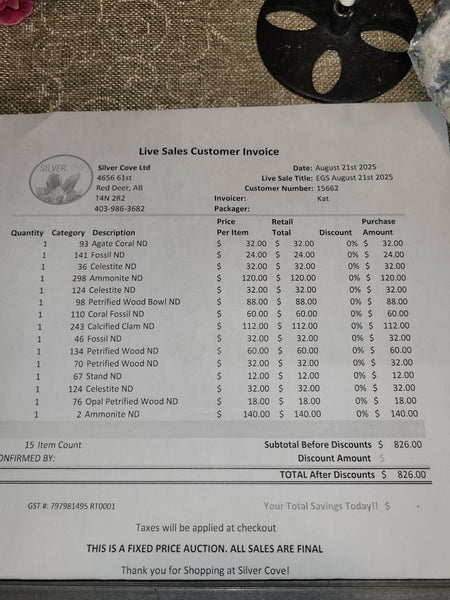 We hope you had a wonderful time on our recent live sale auction. We love sharing our passion for the mineral kingdom with you. Below you will find the packing list with the items you purchased. These items are wrapped, packed, and ready to go when you are. Items purchased in the auction are due within 14 days of the live. Invoices can be combined in your cart, allowing you to check out multiple live events, plus items on the online store seamlessly. If any of the items were already discounted in the live sale auction, you will see them in a separate column in the listing below. We will reverse engineer the listing so that it reflects properly in your cart.  We love what we do and thank you for being a part of our success. We hope to see you on another live sale auction very soon.