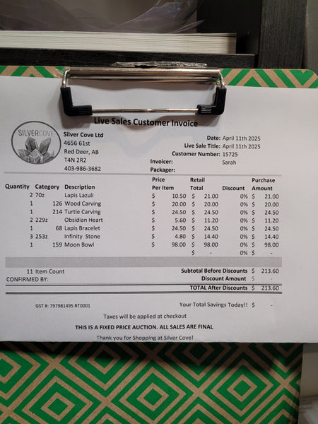 This is your invoice for the date listed above, and we hope you are as excited to get your items as we are! A photo of you invoice and your item(s) are included in this listing for you to review.