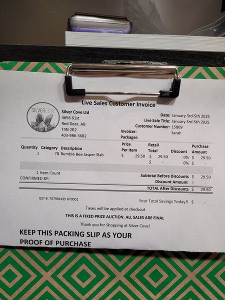 This is your invoice for the date listed above, and we hope you are as excited to get your items as we are! A photo of you invoice and your item(s) are included in this listing for you to review.