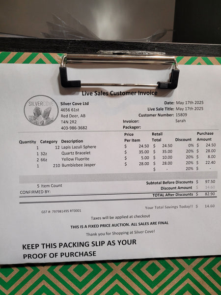 The total is already discounted with any sales you received, and you invoice is ready for check out. All you need to do is add it to your cart, along with any other items you would like to purchase and we will get your treasures on the way!