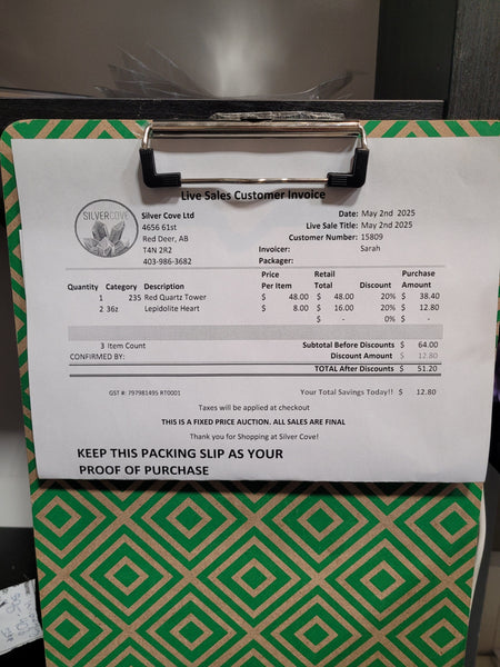 The total is already discounted with any sales you received, and you invoice is ready for check out. All you need to do is add it to your cart, along with any other items you would like to purchase and we will get your treasures on the way!